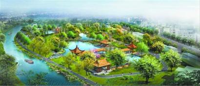 夏芳園位于煤礦設(shè)計(jì)院橋和萬泉橋之間,總面積49599平方米,全長(zhǎng)916米,圖為效果圖